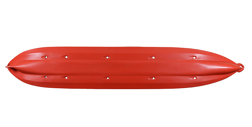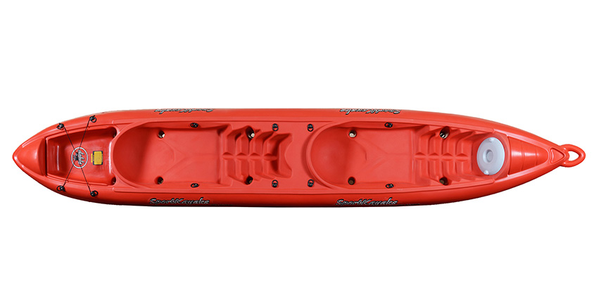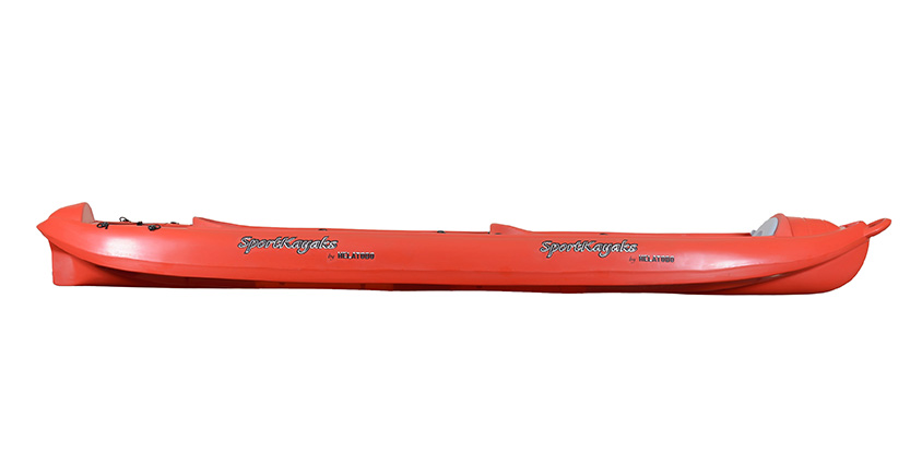 Kayak recreacional para 2 personas. Posee manija de agarre y toma para traslado en proa y popa respectivamente, tambucho en proa y espacio para caja de pesca en popa, 10 imbornales para el drenaje del agua, fijaciones y quilla fija en popa.