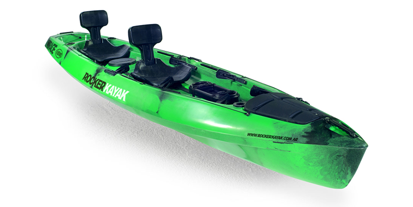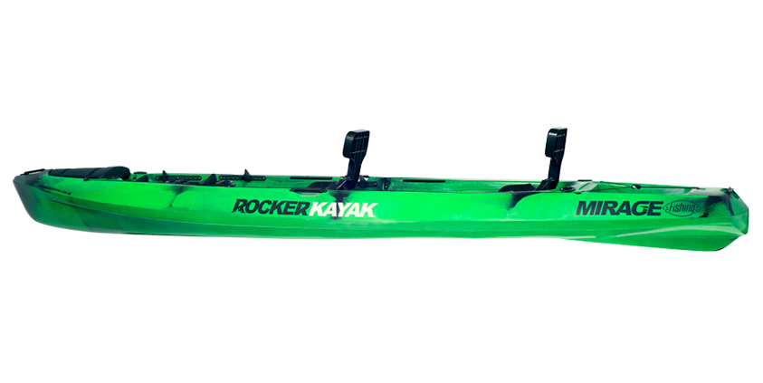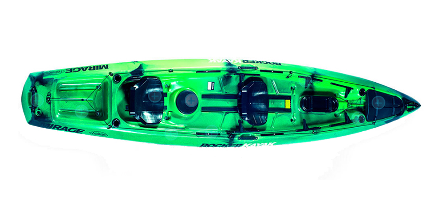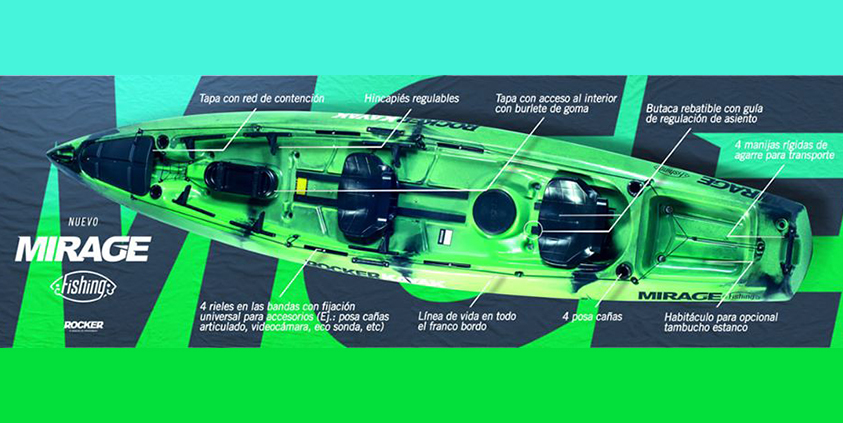 Adaptamos nuestro clásico Mirage para hacerlo pesquero y para mejorar la experiencia en el deporte. Al igual que el modelo tradicional, es un kayak que puede ser usado de forma doble, triple e incluso simple y cuenta con sus cuatro posacañas, sus dos guanteras y su habitáculo de siempre. Incluye, además, dos nuevas butacas rebatibles con guía de regulación de asiento, una tapa con acceso al interior adicional y línea de vida en todo el franco bordo. Sus cuatro rieles en las bandas con fijación universal sirven para accesorios como posacañas articulado, videocámara y ecosonda. Mantiene su estructura y la posibilidad de agregar un tercer asiento