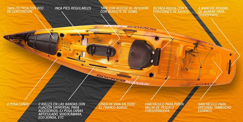 El Wave Fishing es la transformación de la versión clásica de nuestro WAVE. Tal como lo dice su nombre es pescador y trae accesorios ideales para ese fin. Este nuevo kayak cuenta con una tapa de buen acceso al interior que da la posibilidad de guardar un equipo (y hasta una caña entera). Posee, además, dos rieles en cubierta para fijación universal de accesorios como Go Pro, posa cañas articulado, ecosonda, etc. Cuenta también con una línea de vida en todo el perímetro de cubierta con muy buenas fijaciones para su practicidad. Tal como el modelo convencional, es el kayak ideal para pasar largos períodos de tiempo en el agua. Su butaca con respaldo incluido ofrece gran comodidad. El hincapié y la butaca son regulables, favoreciendo el confort a medida. Incluye 2 posa cañas en proa y 2 en popa y dos habitáculos extra en popa muy convenientes para llevar caja de pesca o heladera.