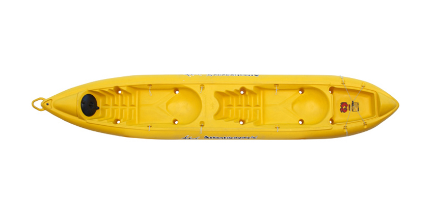 Kayak abierto para dos personas; posee en proa, una manija para su fácil traslado y amarre, pequeño tapón para equilibrar presión interna con la externa y un tambucho con tapa a rosca; en popa posee un baúl de carga, una pequeña toma para traslado y una quilla fija. El kayak presenta dos series de hincapiés para una cómoda remada y 10 imbornales que lo hace autovaciable. Posee en sus bandas una serie de fijaciones para asiento, caja de pesca, fondeo, etc.